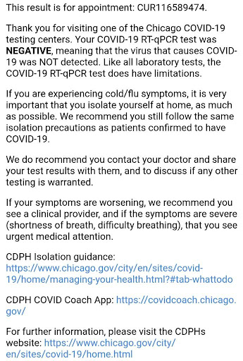 A COVID-19 test is limited in that it represents only a snapshot in time. Test results are given 7 days a week up until 9pm.